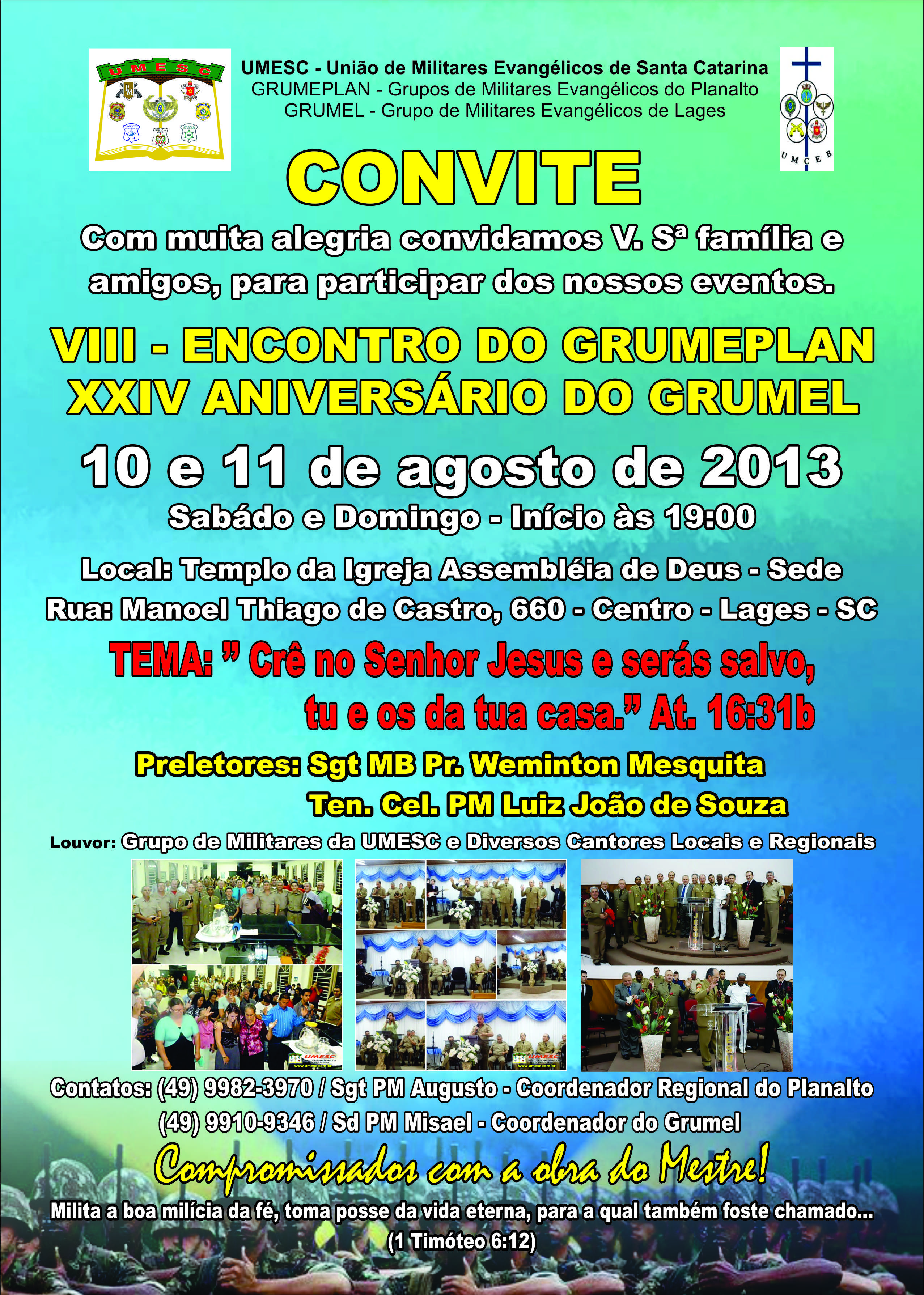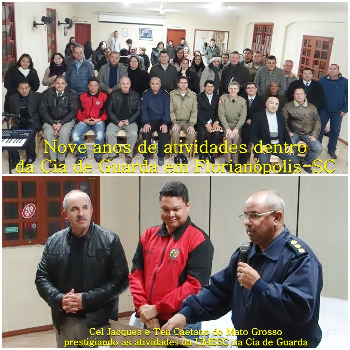 Foi realizado na data de 24 julho 2013 a comemoração dos nove anos de criação do Grupo da Cia de Guarda em Florianópolis-SC. Tivemos a presença de vários militares da região bem como a ilustre presença do Presidente da UMCEB e UMESC Cel Pr Emilson bem como a presença do Cel PMMT Jacques Presidente da UMEMG União de Militares Evangélicos do Mato Grosso e o Ten Caetano.