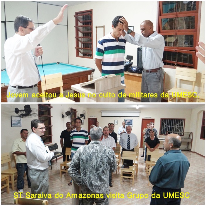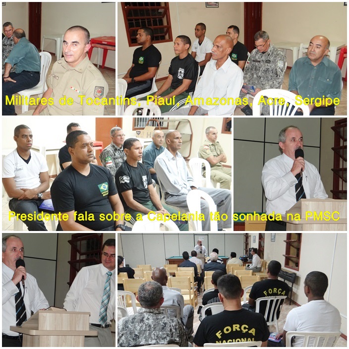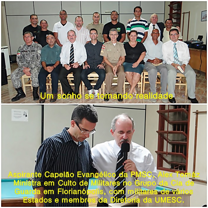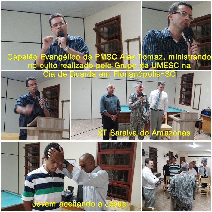 Foi com muita alegria que recebemos a presença do Capelão da PMSC Alex Tomaz de Almeida, convidado para ministrar pela primeira vez em um culto de Militares em Santa Catarina. O Grupo da UMESC na Cia de Guarda na coordenação de nossos guerreiros militares que a quase nove anos estão na frente do Grupo. Neste culto também tivemos a presença do Presidente da UMCEB e UMESC Cel e Pr Emilson Carlos de Souza, bem como vários militares da Força Nacional de outros estados do Brasil. Parabenizamos aos organizadores pelo brilhante trabalho em que no final tivemos com alegria a decisão de um jovem para Jesus.