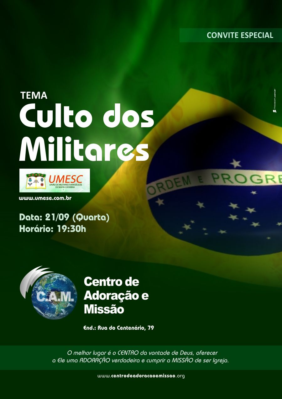 OBS: Como o Culto é de Militares – solicitamos aos militares que se possível comparecem fardados, pois isto irá dignificar ainda mais nossa profissão junto a comunidade navegantina.