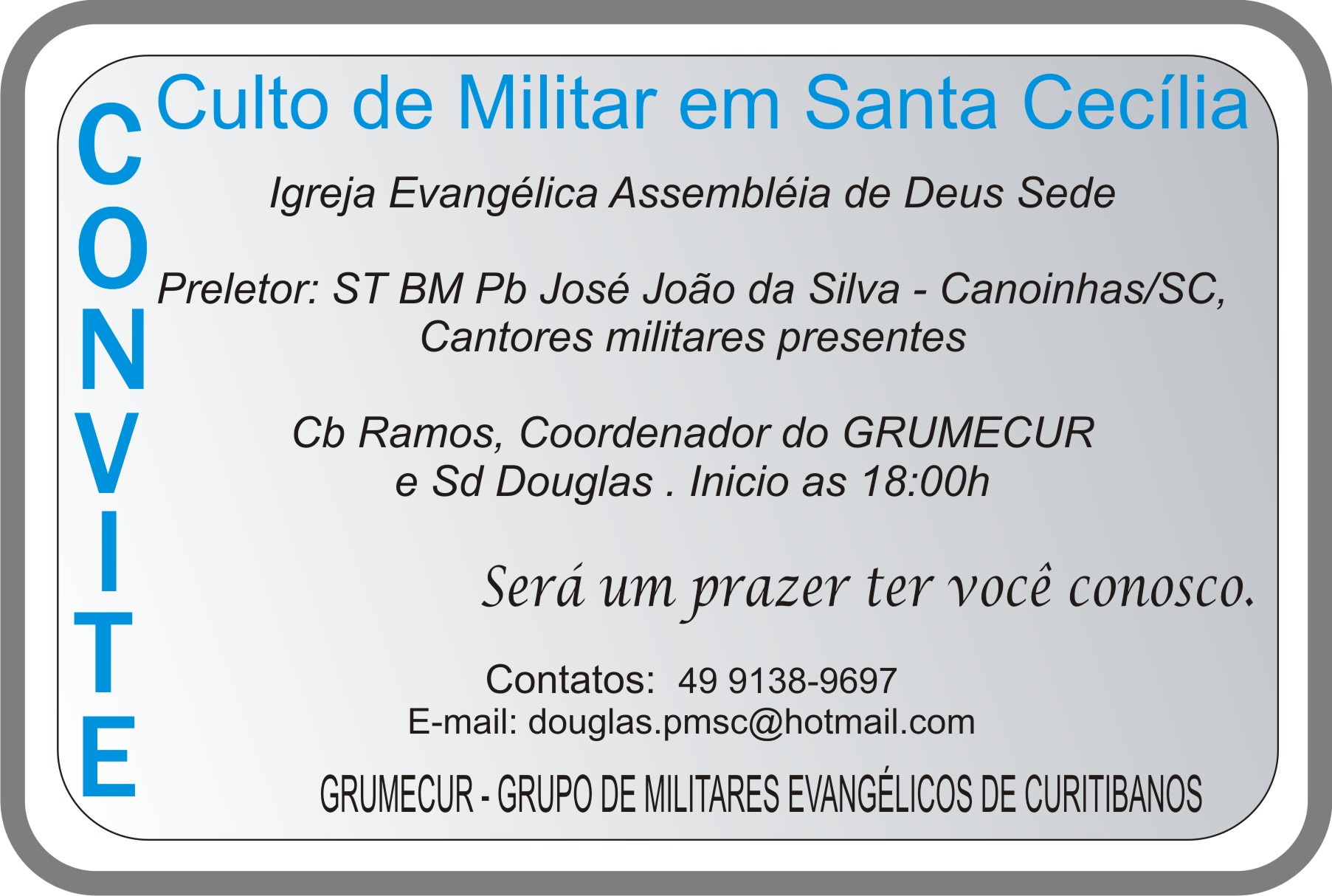 Neste ultimo domingo, 21 de agosto de 2011, aconteceu na Igreja Evangélica Assembléia de Deus em Santa Cecília, evento com a participação da UMESC (União dos Militares Evangélicos de Santa Catarina). Marcou presença o presidente da UMESC Coronel PM Pr Emilson da cidade de Florianópolis, e demais autoridades do município como o Excelentíssimo Juiz de Direito Doutor Rafael Maas dos Anjos, e sua acessoria, o Presidente e a vice-presidente da Câmara de vereadores Antonio Marcos Hahn e Janete Mocelin, o vereador Natalicio de Jesus, e militares evangélicos de Curitibanos, Ponte A. do Norte, Lebon Régis, Lages, Canoinhas, Timbó Grande e Florianópolis. O coordenador do grupo Cabo PM Ramos e o Policial Douglas organizaram o culto de agradecimento. Como surpresa, Cabo Ramos foi surpreendido ao ser consagrado em seu ministério como Missionário do Grupo de Militares, o evento foi marcado pela participação de militares, bandas com louvores e palavras de agradecimento. O Pastor Rogério Cidral presidente da igreja, elogiou a organização deixando clara a intenção de realizar outros cultos do gênero.