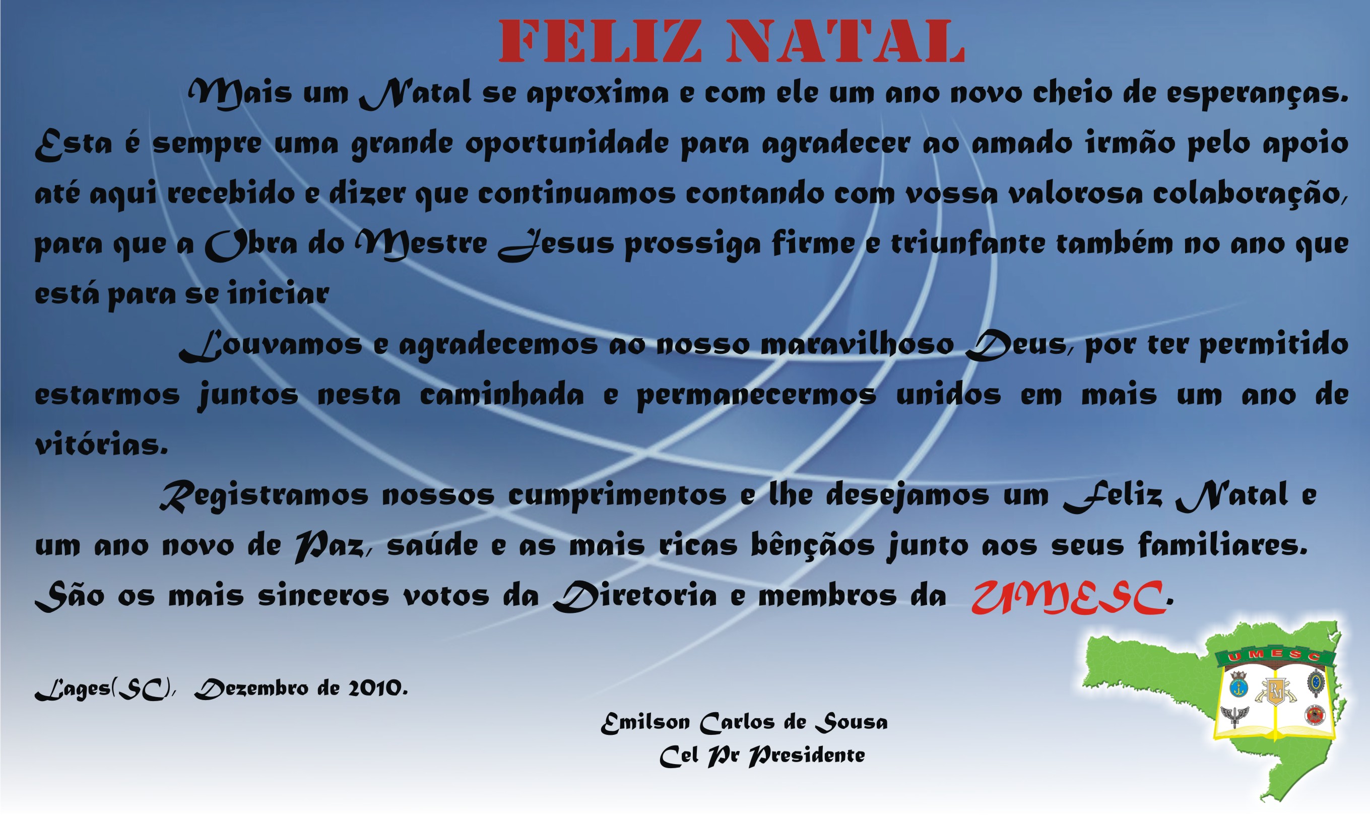 A Paz do Senhor Jesus Cristo a todos, o Grupo de Militares Evangélicos de Sombrio deseja dar as Felicitações de Natal e de mais um ano que se aproxima, e que assim como o Deus Todo Poderoso até aqui esteve com cada um nós, cremos que pela sua Fidelidade, pelo seu Amor e pela sua Misericórdia estará conosco pelejando para que a sua vontade seja realizada na vida de cada um dos seus filhos. As lutas, as tribulações e as provas virão por certo, mas não é para que venhamos nos assustar, pois está, e vai adiante de nós o VARÃO DE GUERRA,O LEÃO DA TRIBO DE JUDÁ, cortando os laços do Diabo em nosso favor, fomos chamados e escolhidos dentre milhares para uma batalha que já foi vencida pelo Senhor Jesus Cristo, Ele conta conosco. Que a Graça de Deus esteja sempre presente em nossas vidas, e que o nome do Senhor seja sempre glorificado. Um abraço a todos os irmãos