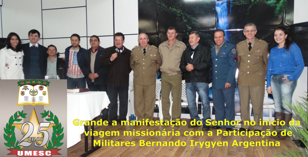 Deslocando na manha seguinte dia 30/05 a Argentina para participar do 1º Culto de militares em Bernardo Iregoyen. o Pr Vilacio deu abertura dando as oportunidades e passado o vídeo da UMESC, o presidente Cel Emilson comentou sobre o objetivo da viagem. A pregação pelo Cb Cláudio Luz, onde Deus movimentou grandemente e vidas foram edificadas e almas que aceitaram a Jesus. Pernoitamos na residencia do Pr Vilacio seguindo na manha do dia seguinte para Santa Rita, Paraguai.