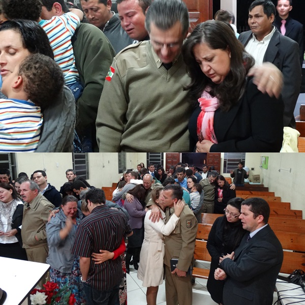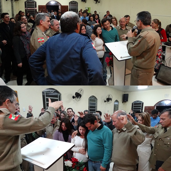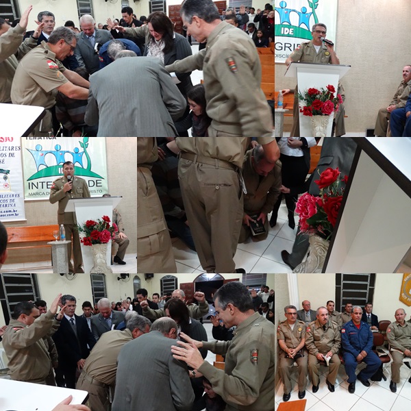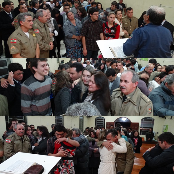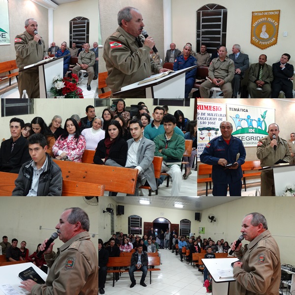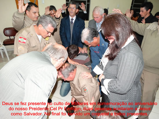No dia de hoje, nós Militares Evangelicos participamos de um maravilhoso culto na Igreja do Evangelho Quadrangular do bairro São Marcos, aonde sentimos a presença de Deus nos louvores, na pregação da Palavra de Deus ministrada pelo Pastor Major Geovane Fachini... Estavamos num numero pequeno de Militares devido ao trabalho na cidade de Barra Velha, aonde os Militares de Joinville foram representar o grupo do Grumeville, mas Deus se fez presente e podemos ver e sentir o agir do Espirito Santo... A pedido do Presbitero Sd Charles Adriano que dirigiu o culto, esplanamos as atividades da Umesc e Grumeville e o Pastor da igreja sensibilizado com o trabalho missionário da Umesc, levantou uma oferta que fora arrecado o valor de R$ 313,00 reais que será revertido a conta da Umesc para campanha missionária.