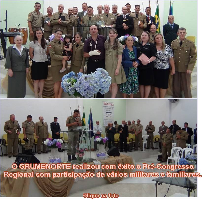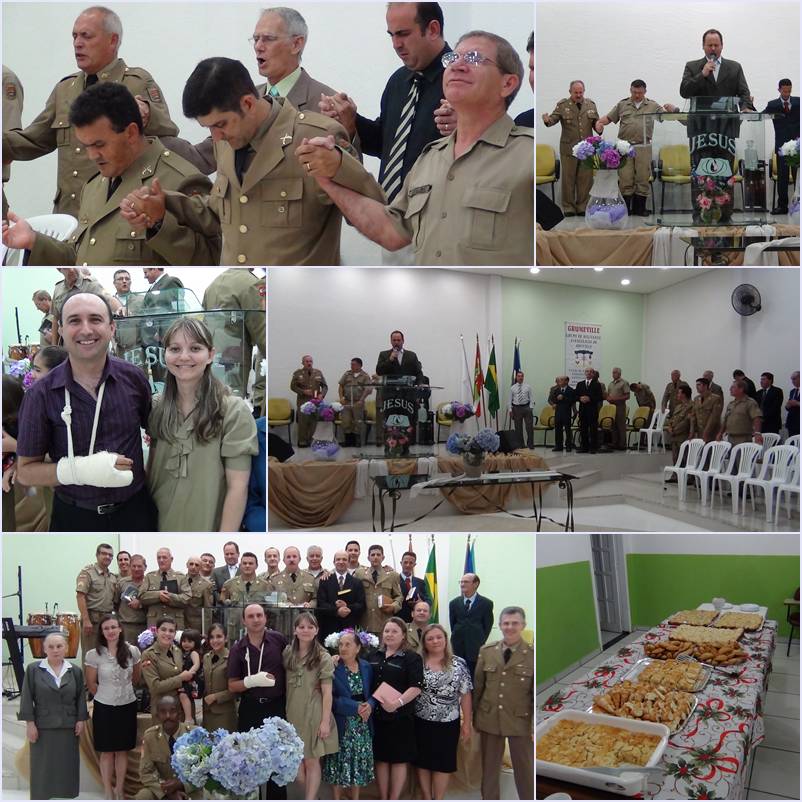 Aconteceu no dia 15/12/2011, na cidade de Lages no bairro Santa Catarina, congregação da Igreja Evangélica Assembléia de Deus, um maravilhoso culto de militares com uma expressiva participação dos integrantes do Grumel e também do Grupo do Exército de Lages. Foi uma benção em todos os sentidos do culto, nos trasendo a palavra de Deus o Pb Sd BM Selmir, cheio de graça e unção. Para fechar com chave de ouro, um militar da reserva remunerada aceitou a Cristo, como único e suficiente Salvador. Deus seja louvado por mais está vitória.