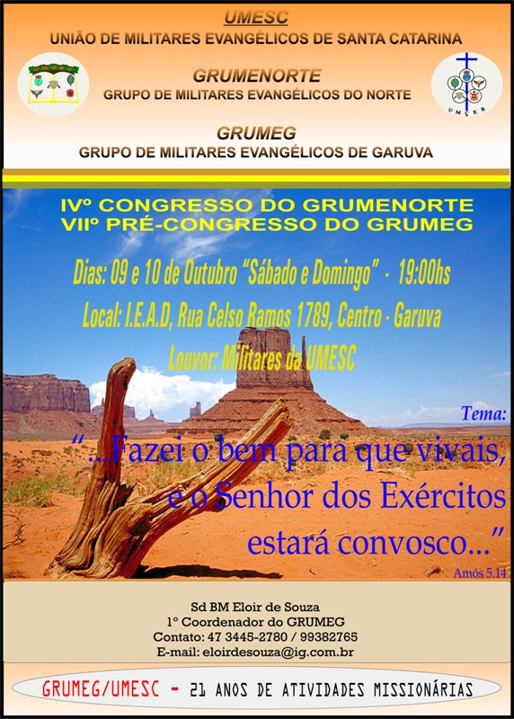* Dia 25 – MASSARANDUBA – SABADO - Culto de Militares Evangélicos, na I.E Raiz de Jesse, Rua Viscto Bramoski, 755, centro, Preletor Claudio Luz, Secretario da UMESC, Itapema-SC. 1º Coordenador Sgt Camargo Contato: 47 3370-6387 / 88499362 E-mail: