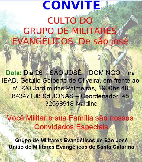 * Dia 26 – JOINVILLE – DOMINGO - Culto de Militares Evangélicos, na IEAD, Bom Retiro, sito a Rua Tenente Antonio João, Joinvile, 19h00min, contato ligue para mim..3438-0177/8432-3363/9994-7190. Cb Bento 47 3436-5013 / 9994-6450, Valmir Miliovini, coordenador do Grumeville.