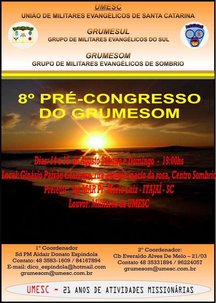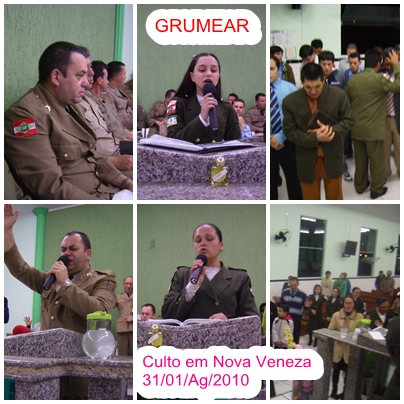 Foi realizado no início do mês corrente, na I.E.A.D. do bairro Vila Nova em Barra Velha, um encontro de militares alusivo ao aniversário do grupo GRUMEVI – grupo de Militares Evangélicos de Barra Velha -. O encontro que foi coordenado pelo Sgt Vilmar de Mello, 1º coordenador do grupo, contou com a presença de vários autoridades cristã, dentre elas, a presença do presidente UMCEB/UMESC, Cel Pr Emilson de Souza, e seu vice, Sgt Pb Arlindo Rotta que exerce também, a função de Secretário da UMCEB, todos que ali estiveram presentes, puderam sentir a presença de Deus na palavra ministrada, pelo, Sgt RR Pr Dorval Nogueira, da cidade de Blumenau.