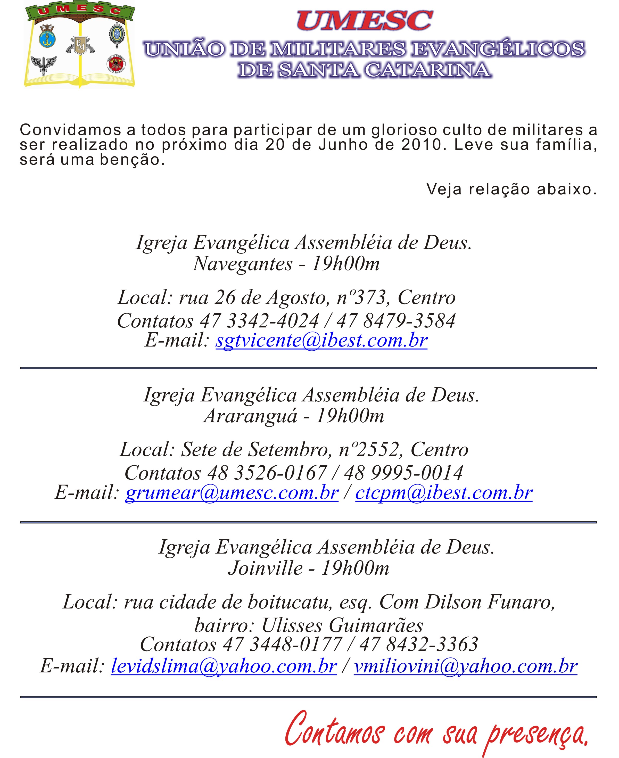 Em Navegantes, no mês de junho, foi realizado com a coordenação do Sgt BM Vicente, coordenador do GRUMENAV um glorioso culto de militares, onde se fez presente o presidente da UMCEB/UMESC, e demais membros da diretoria, assim como tesoureiro e vice-presidente. Deus esteve naquele lugar e, abençoou mais um culto dentre tantos outros.