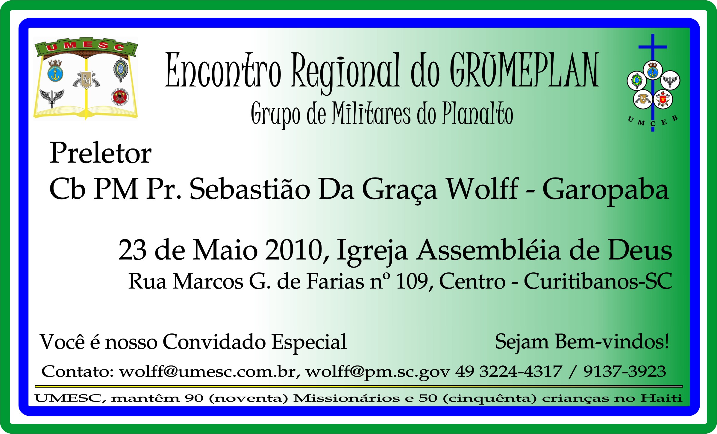 Foi realizado no dia 22 de maio de 2010, sob a coordenação do Sub. Ten. PM Eduardo Roberto Bento, Coordenador Regional de Florianópolis, um grandioso culto na IEAD do Bairro Bela Vista em São Jose, onde Deus se manifestou poderosamente, usando seus servos nos louvores, como também na mensagem da palavra, Assim usando uma de suas Servas para falar com o Irmão Juarez (futuro Missionário da UMESC) se Deus quiser, pois confirmando a resposta ao seu desejo pela missão e, era a resposta que o Irmão Juarez aguardava ansioso para esse trabalho, ser Missionário da UMESC, vamos aguardar em Deus, a aprovação do convênio com a CELESC, vamos orar... Agradeço a Deus por saber que Ele está em vosso meio. Amem.
