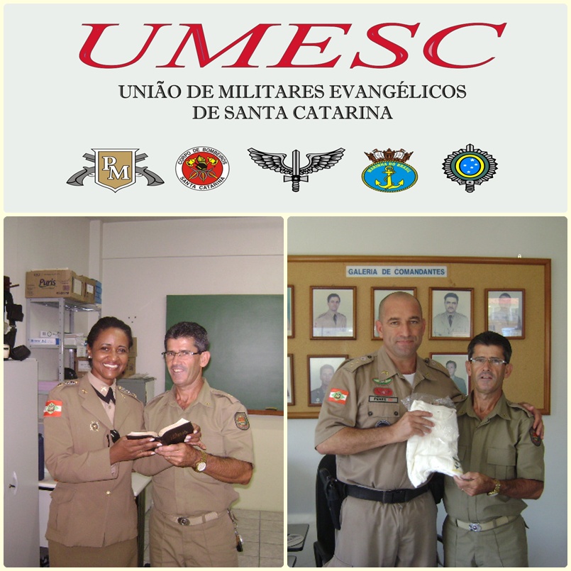 Sub Ten PM João Teodoro Fernandes, 1º Coordenador de GRUMEBI, em nome da UMESC entregou Bíblias e Camisas para dois militares de Santa Catarina, Sra. Maj PM Edenice da Cruz Fraga, Sub Cmt do 24º BPM e, Sr. Ten Cel PM Heriberto Rocha Peres, Cmt do 24ºBPM.