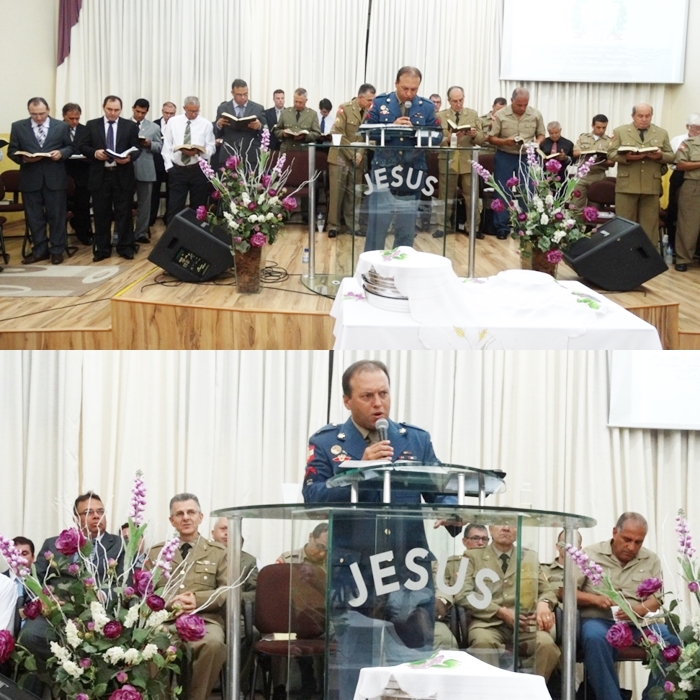 Louvores pelos militares Cb Vaz de Itajaí, ST Góis de Rodeio, Sgt Goulart de Blumenau, Cb Iran de Lages e a ministração da palavra o Cb Ev Claudio Luz de Itapema.